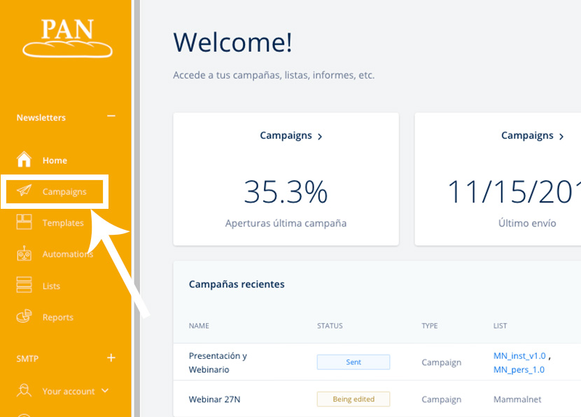 Como podemos observar, están las campañas que hemos mandado y las estadísticas simplificadas de la última campaña. Para crear una nueva campaña, nos debemos fijar en el menú de la izquierda. Y pinchar en la pestaña: Campañas.