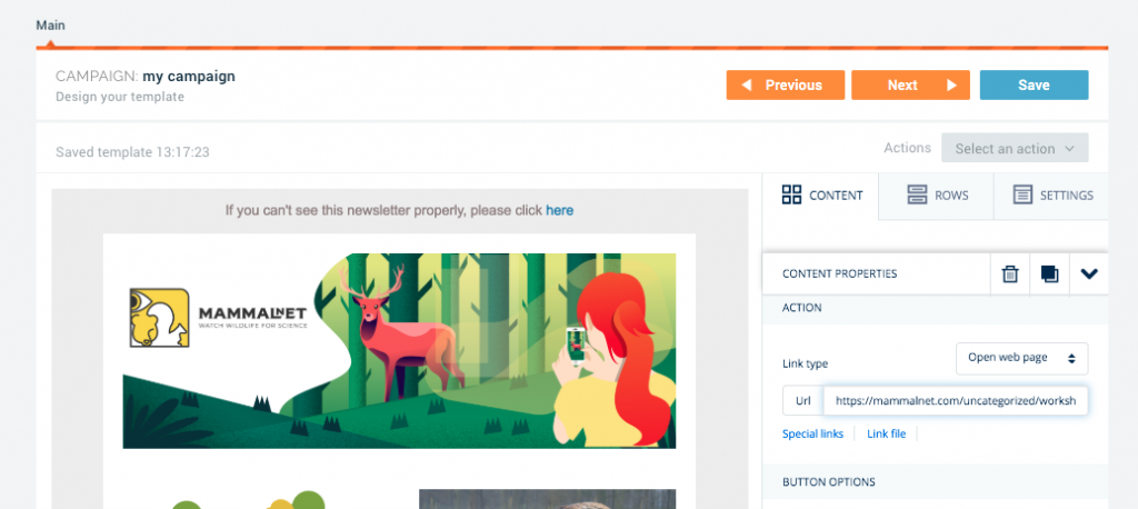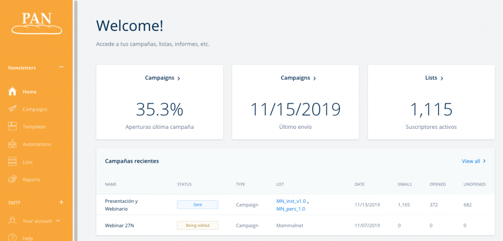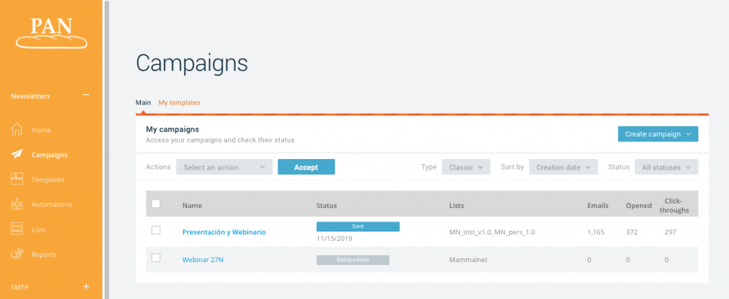 Aparecerá un listado con todas las campañas que hemos enviad, así como un botón para poder crear una nueva campaña.