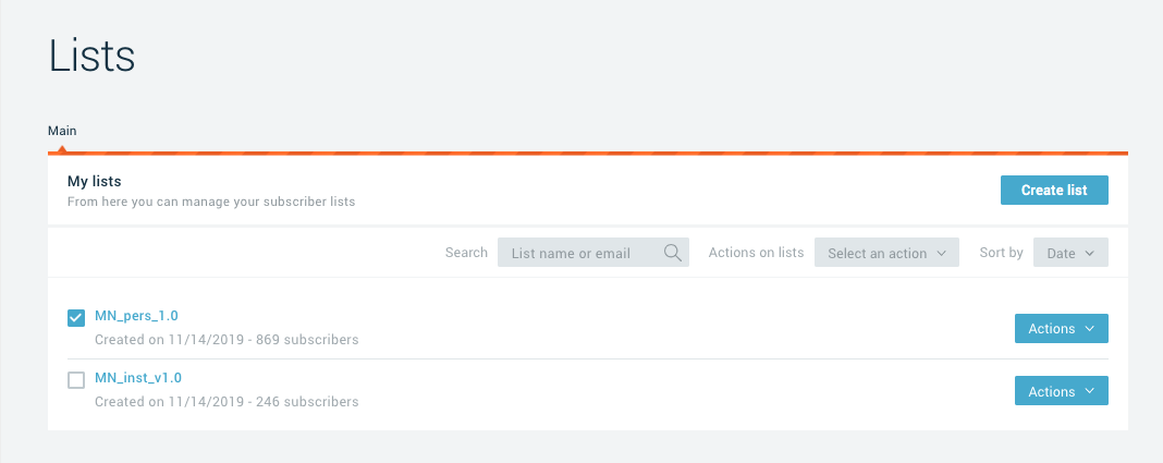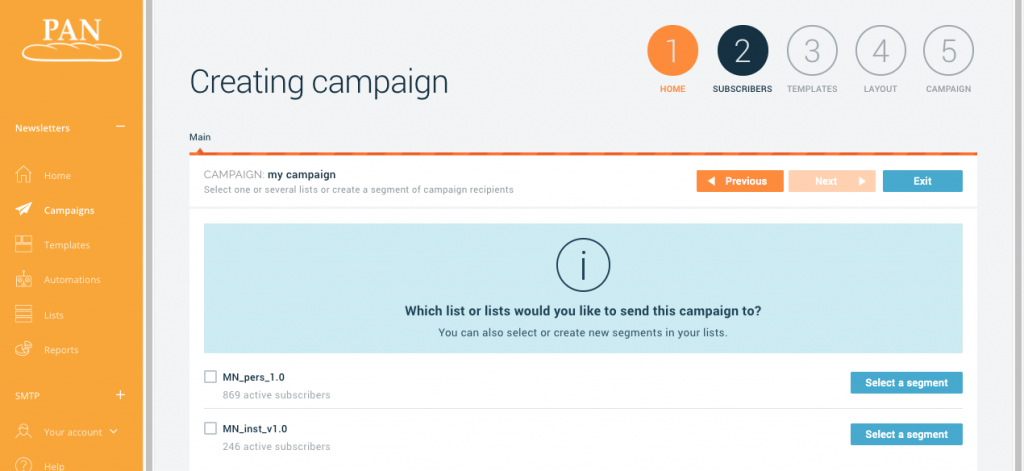 Como podemos observar, el punto 1 nos aparece en naranja (como completado) y el 2 en negro, ya que es el que estamos editando ahora mismo. El punto 2 corresponde a los suscriptores, que serán los que reciban el mail. Para continuar, tenemos que seleccionar obligatoriamente una o varias listas creadas o un segmento de las mismas. Si no sabes cómo crear una lista, pincha aquí.
