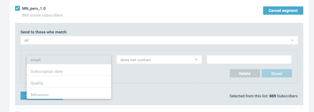 Pinchamos en + Añadir condición y podremos seleccionar a qué segmento de nuestra lista queremos mandar el mail