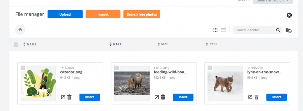 Es un listado con todas las imágenes que hemos subido para usar en nuestros newsletter. Si se encuentra ahí la imagen que queremos usar, solo tenemos que darle a insertar, pero si por el contrario, queremos utilizar una imagen nueva, debemos subirla primero. Para ello, le damos al botón de arriba Subir y se abrirá el finder de nuestro ordenador. Ahí tenemos que buscar y seleccionar la imagen que queramos usar y darle a subir.