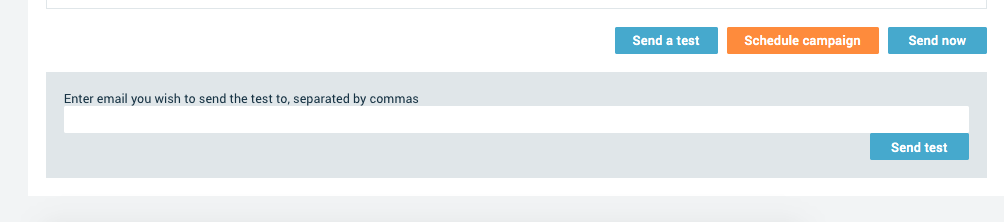 Si pinchamos en Enviar una prueba se desplegará la opción de meter uno o varios mails separados por comas. Es recomendable mandar primero pruebas antes de la campaña, para ver que todo esta correcto. El mail que llegará al correo que hayamos puesto, será igual que el que les llegará a los receptores finales del mailing.