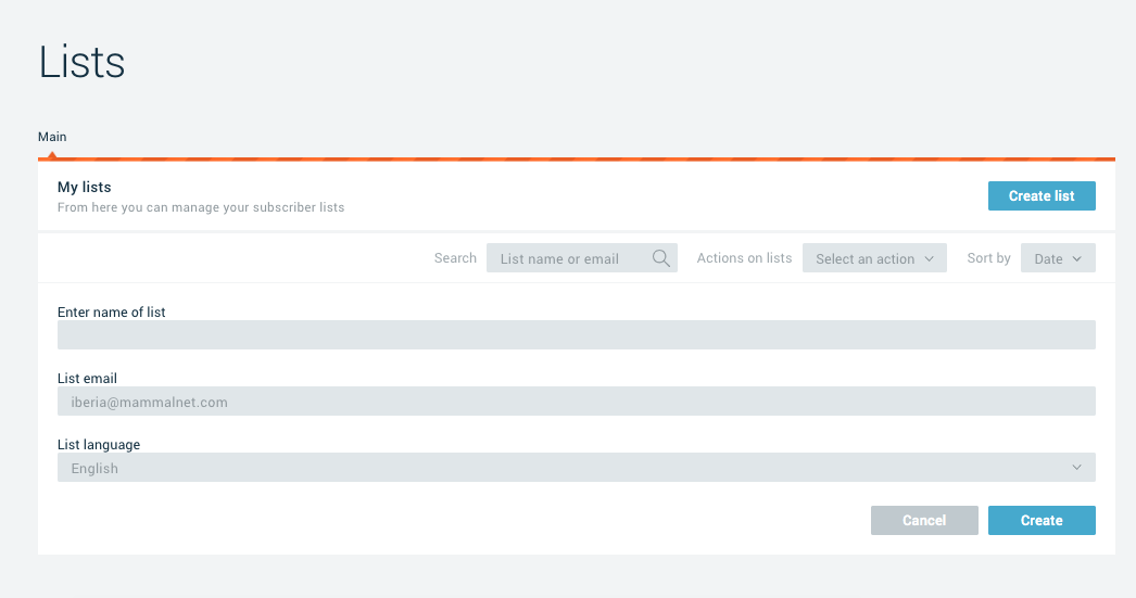 Tenemos que introducir un nombre para nuestra lista, el email que irá asociado a la misma y el idioma de la lista. Una vez rellenemos eso, le tenemos que dar a Crear.