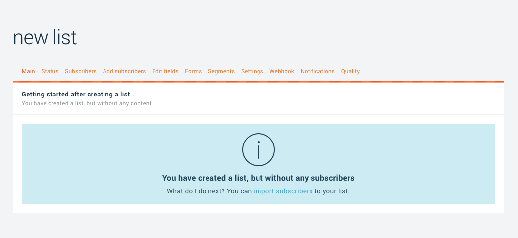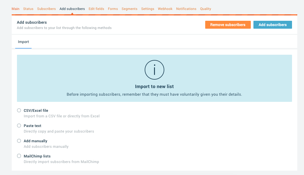 Para meter suscriptores en al nueva lista, tenemos que darle a Importar suscriptores.