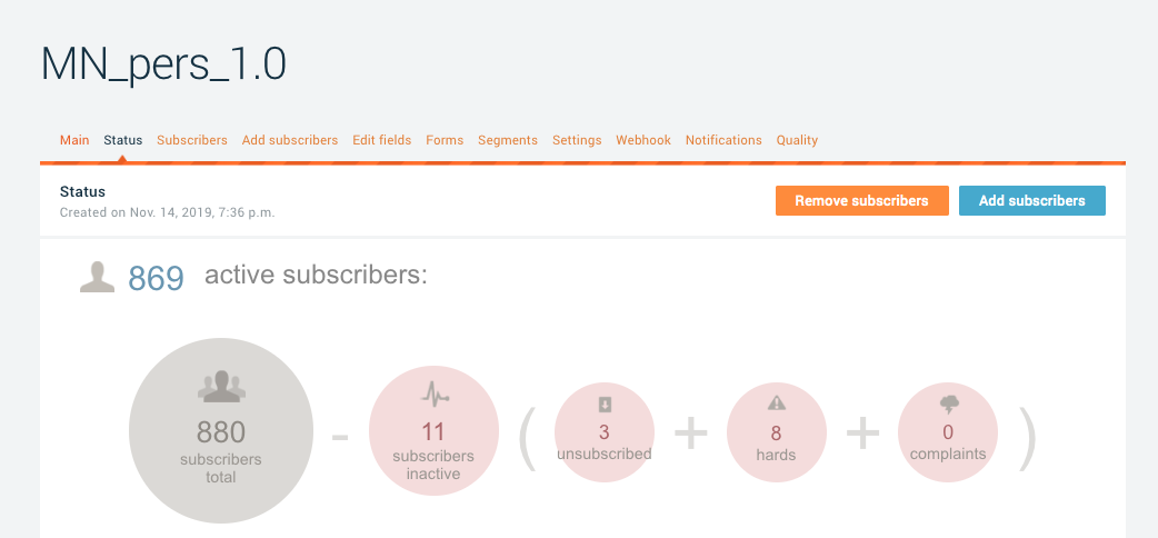 Aquí podemos observar las características de nuestras listas. Para Añadir o Quitar suscriptores tenemos que pulsar en sus botones correspondientes.