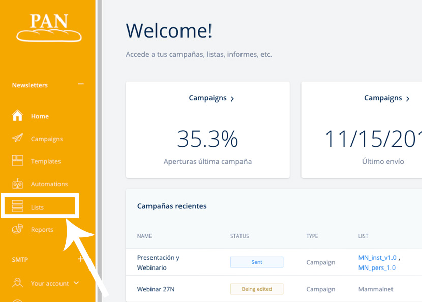 Para crear una nueva lista, tenemos que volver a la página principal y pulsar en Listas, en la columna de la izquierda